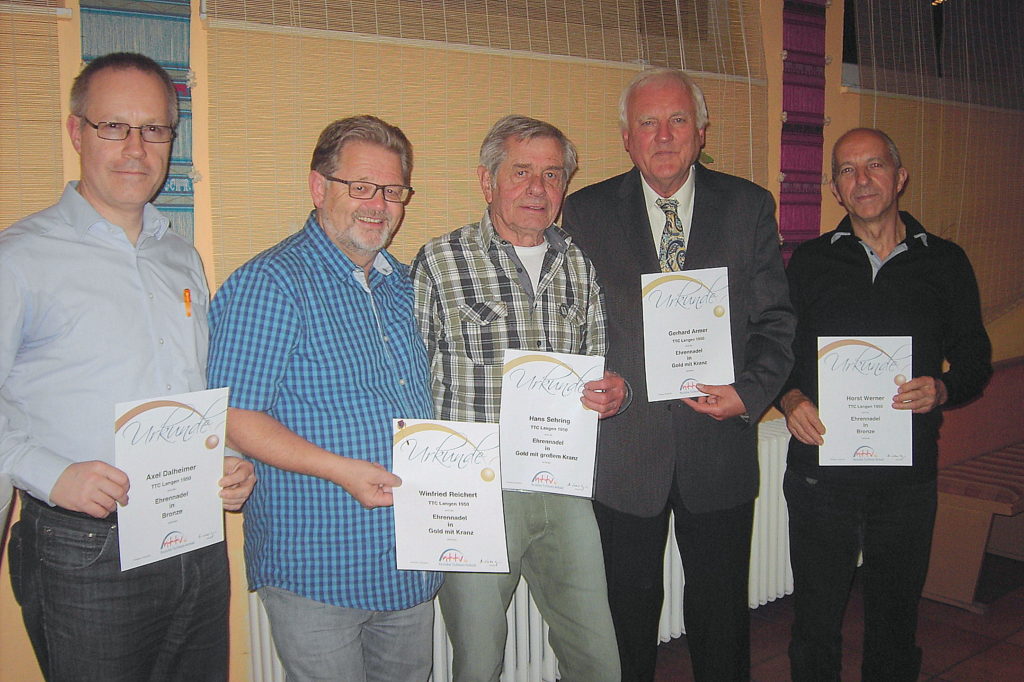 | 2016 | Rückblick Saison 2015/2016 Der Verlauf der gesamten abgelaufenen Saison 2015/2016 gestaltete sich als sehr ereignisreich und aufregend. Trotz der Handicaps zweier Handbrüche wurde unsere 1. Herrenmannschaft souverän Meister der Hessenliga Süd- West. Dabei zeigte sie in der Rückrunde nahezu ausnahmslos begeisterndes Tischtennis. Den verdienten Lohn, den Aufstieg in die Oberliga, konnte der TTC Langen allerdings nicht wahrnehmen. Wegen der enormen Spielstärke dieser Klasse hätten wir uns mit einem weiteren Spitzenspieler verstärken müssen, um wenigstens ungefährdet die Klasse halten zu können. Das wäre aber finanziell nicht machbar gewesen. Zudem hatte sich unser Spitzenspieler entschlossen, ein Angebot eines Vereins der Schweizer Bundesliga für die nächste Spielzeit anzunehmen. Damit hatten sich die sportlichen Perspektiven beim TTC Langen für die nächste Saison deutlich verschlechtert. Unsere bisherige Nummer zwei schloss sich daraufhin der TuS Kriftel an, um dort zusammen mit seinem Bruder in der dortigen Oberligamannschaft spielen zu können. Da zwei weitere Spieler den finanziellen Verlockungen eines anderen Vereins erlegen waren, werden wir unsere 1. Herrenmannschaft in der nächsten Spielzeit mit den Spielern aus unserer „Zweiten“ ergänzen. Erfreulich war für uns der Zugang eines der besten Spieler Hessens im Schüler- alter, der an Position 6 in der 1. Mannschaft spielen wird. Damit setzt sich die Philosophie des TTC Langen fort, jungen, ambitionierten Spielern eine Plattform zu bieten, um später höhere Ziele verwirklichen zu können. Ziel für die nächste Spielzeit wird nach alledem der Klassenerhalt in der Hessenliga sein. Unglaubliches Verletzungs- und Krankheitspech verhinderten den Klassenerhalt der 1. Damenmannschaft in der Regionalliga West. Nach deren Abstieg startet der TTC Langen mit 2 Damenmannschaften in der Oberliga Hessen. Da die 1. Mannschaft unverändert an den Start gehen wird, kann auf einen Wiederaufstieg gehofft werden. Mit deutlichem Vorsprung wurde die 4. Damenmannschaft Klassensieger in der 1. Kreisklasse und steigt in die Kreisliga auf. Ebenfalls aufgestiegen ist die 3. Herrenmannschaft als Tabellenzweiter in der Bezirksklasse. Beindruckend waren zudem andere Erfolge: im Verbandspokal wurde die 1. Herrenmannschaft in ihrer Klasse Hessenmeister und schaffte bei den Deutschen Pokalmannschaftsmeisterschaften der Verbandsklassen Platz 2. Hessische und Deutsche Meisterschaften sprangen bei den Seniorenwettbewerben heraus. Die Platzierungen der Mannschaften des TTC Langen ergeben sich aus der beigefügten Übersicht. Ehrung bei Jahreshauptversammlung Heinz – Georg Klenk nahm als Vertreter des Ehrenrats des Hessischen Tischtennisverbandes die Gelegenheit wahr, verdiente Vereinsfunktionsträger anlässlich der Jahreshauptversammlung des Tischtennis- Clubs Langen am 25. Mai 2016 zu ehren. Ehrung bei Jahreshauptversammlung So erhielten (auf dem Bild von links) Axel Dalheimer Urkunde und Ehrennadel in Bronze für seine Tätigkeit als Schriftführer seit 1992, Winfried Reichert Urkunde und Ehrennadel Gold mit Kranz für u.a. 30 Jahre Tätigkeit als 2.Vorsitzender, Hans Sehring Urkunde und Ehrennadel in Gold mit großem Kranz u.a. für seine Tätigkeit als 2. Vorsitzender seit 1964, Gerhard Armer Urkunde und Ehrennadel Gold mit Kranz u.a. für den Vereinsvorsitz seit 30 Jahren und Horst Werner Urkunde und Ehrennadel in Bronze für die Leitung der Hobbyabteilung seit 1999. |