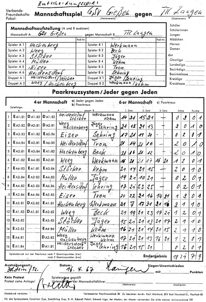 Die Dramatik dieser für den TTC so wichtigen Begegnung wird aus dem Spielberichtsbogen und dem Bericht der Langener Zeitung vom 21.04.1967 noch einmal deutlich.