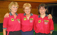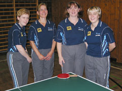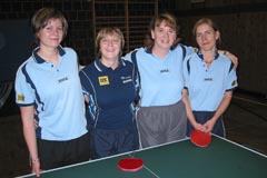 Erfreuliches gibt es dagegen insbesondere von der 1. Damenmannschaft zu berichten, schaffte sie doch mit dem 2. Tabellenplatz in der Hessenliga Süd / West den Aufstieg in die Oberliga des Südwestverbandes. Zur erfolgreichen Mannschaft gehörten von links Barbara Lämmlein, Christine Weber, Maria Konetschnik und Spitzenspielerin Alexandra Brons.