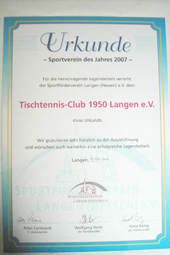 Anlässlich der Sportlerehrung der Stadt Langen am 10.3.2008 wurde der TTC Langen als Sportverein des Jahres 2007 für seine hervorragende Jugendarbeit vom 1. Vorsitzenden des Sportförder-vereins Langen, Peter Carlstaedt, ausgezeichnet. Die Urkunde nahmen der Ehrenvorsitzende und Ausrichter der Mini-Meisterschaften Klaus Mattelat, die Jugendtrainerin Maria Konetschnik und der Jugendtrainer und stellvertretende Jugendwart Jürgen Lotz in Empfang.